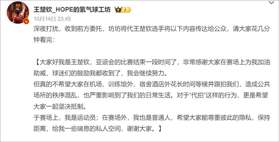 近日,国乒球员王楚钦在机场被跟拍怒怼“粉丝”的视频在网上热传。“希望大家能尊重彼此的隐私,保持距离,给我一些喘息的私人空间。”10月14日深夜,王楚钦发表声明,希望球迷能够理智看待运动员,一起抵制长时间跟拍和“代拍”等饭圈行为。