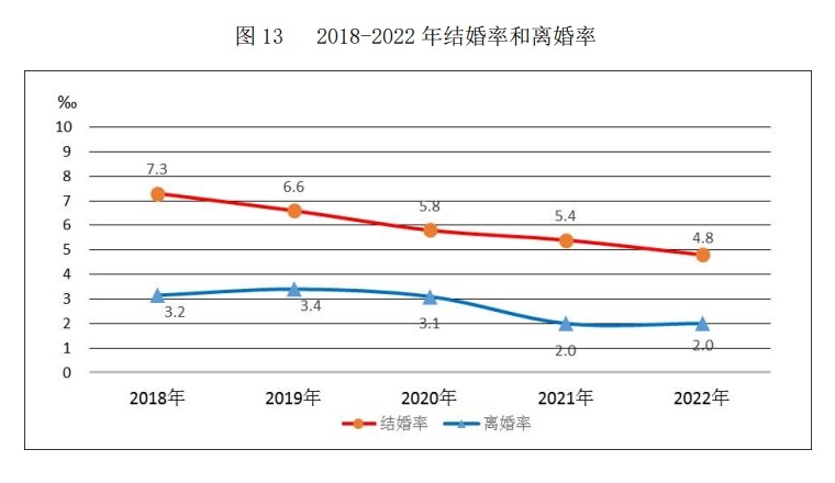 统计公报显示,2022年,全国婚姻登记机构和场所共计4310个,其中婚姻登记机构1103个,全年依法办理结婚登记683.5万对,比上年下降10.6%。结婚率为4.8‰,比上年下降0.6个千分点。依法办理离婚手续287.9万对,比上年增长1.4%,其中:民政部门登记离婚210.0万对,法院判决、调解离婚77.9万对。离婚率为 2.0‰。