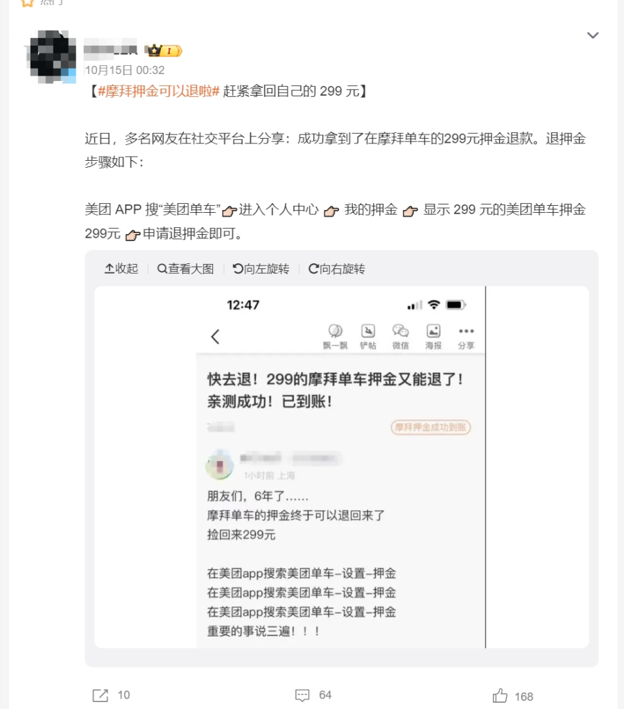 有网友分享了退押金申请步骤:美团APP搜“美团单车”,进入个人中心,点击我的押金,显示299元的美团单车押金,然后申请退押金即可。