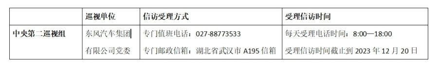 日前,二十届中央第二轮巡视的15个巡视组陆续进驻被巡视单位党组织开展巡视工作。截至目前,中央巡视组已进驻东风汽车集团有限公司,并公布了信访联系方式。