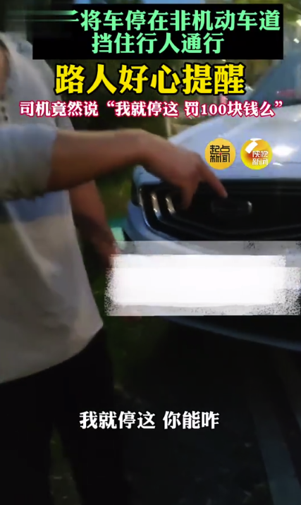 据陕视新闻报道,10月16日,陕西西安雁鸣湖,一男子将车停在非机动车道,挡住行人通行,路人好心提醒,男子不仅不听,反而态度强硬:“我就停这,你能咋?(不就)罚100块钱吗,我能罚”。目前,陕视新闻已经向西安交警曲江大队进行了举报。
