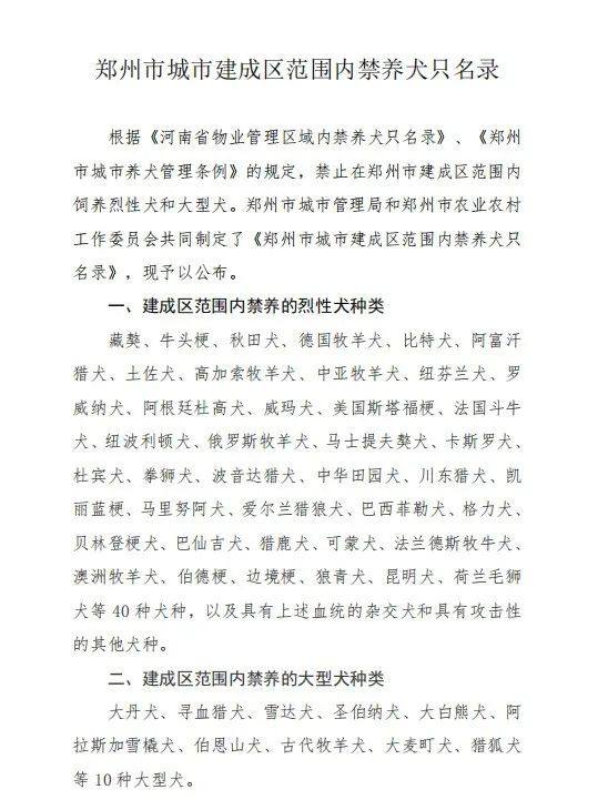 今天,记者从郑州市城管局获悉,根据《郑州市城市建成区范围内禁养犬只名录》规定,以下几种犬只属于禁养范围:据悉,该名录为2019年8月6日,郑州市城管局、郑州市农业农村工作委员会发布的,根据《河南省物业管理区域内禁养犬只名录》、《郑州市城市养犬管理条例》的规定,禁止在郑州市建成区范围内饲养烈性犬和大型犬。