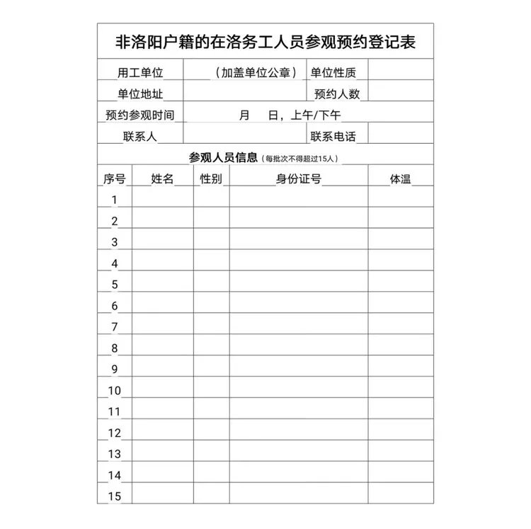 由用工单位统一填写《非洛阳户籍的在洛务工人员参观预约登记表》(参见附表),于参观前一日下午17时前发送至lmjqzhb@163.com邮箱进行预约登记。