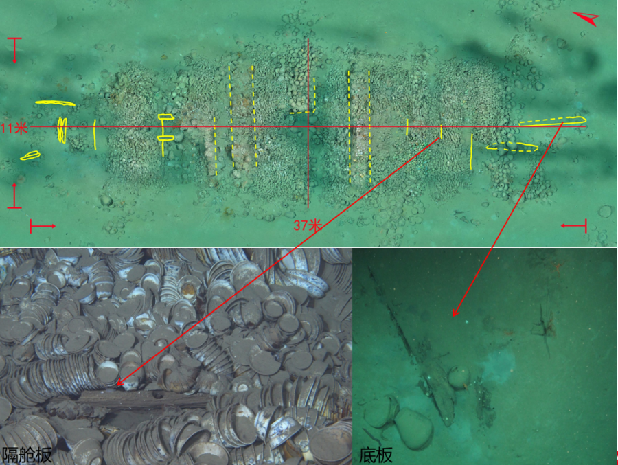 沉船遗址水深约30米,主体区域残存有木质船体和成摞摆放的船货堆积,范围约300平方米。考古发掘发现,沉船船体残长约16.95米,最宽处保存约4.5米,残存9道隔舱板和10个船舱,单层板结构,发现桅座、龙骨板、龙骨补强材以及舭龙骨等船体构件。