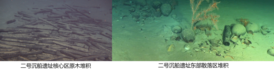 二号沉船遗址位于一号沉船遗址东北约12海里处,由核心区和散落区组成,年代为明弘治年间。核心区为大量码放整齐的原木堆积,长约21米,最宽约8米,核心区西北及东部各有一处由少量原木和陶瓷器散落形成的堆积。二号沉船暂未发现船体,仅在核心区原木堆积中发现一根疑似船构件的条木。
