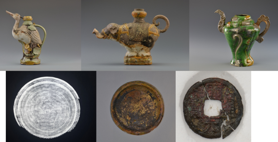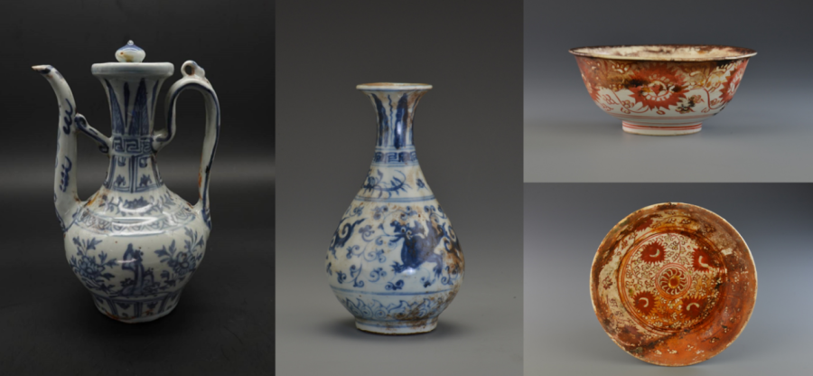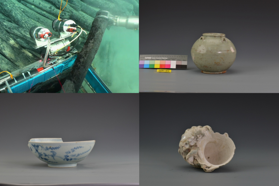 一号沉船遗址有多个隔舱的船货堆积,包括陶器、瓷器、铜器、铁器、竹木器等,数量超十万件,代表性器物有酱釉陶罐,珐华梅瓶,青花执壶、玉壶春瓶,红绿彩碗、盘、杯,青釉玉壶春瓶,青白釉盘、碗,白釉三足圆香炉,蓝釉高足碗,单色釉玉壶春瓶、扁壶,素三彩螺形壶、象形壶、鹤形壶,铁锅,铜盘、铜钱等。二号沉船遗址发现大量尺寸相近、码放整齐的原木及少量陶器、瓷器、蝾螺壳等。
