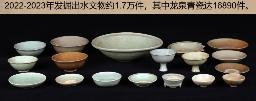 发掘出水文物标本约1.7万件,主要为龙泉青瓷和陶罐、铅锤、印章等船上生活、航海相关文物。其中龙泉青瓷数量达到1.6万余件,器形包括碗、盘、碟、盏、洗、缽、香炉和高足杯等,年代为元代晚期,为典型的外销贸易瓷。结合温州朔门古港的考古发现,推测该沉船可能是从温州港出海前往东南亚的民间贸易商船。