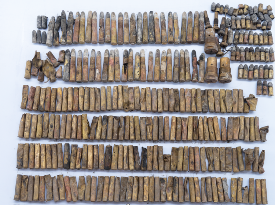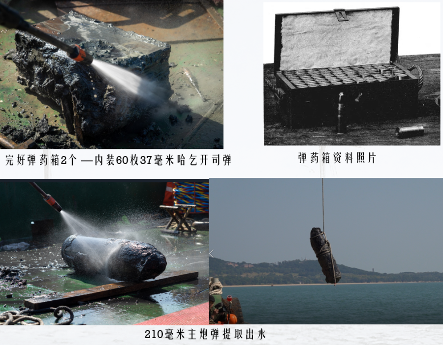 靖远舰于舯部发现2箱完好的37毫米哈乞开司炮弹、艏部发现1枚210毫米主炮开花弹。