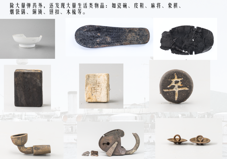 威海湾内的甲午沉舰遗址水深6-10米,遗址分布面积850~2100平方米不等,埋于海泥下0.5~3米,均未发现完整舰体,仅存的遗物呈散落分布状态。发掘出水遗物包括船体构件、船员生活物品和武器弹药等,结合遗物种类能判断原舰体的艏、舯及艉部等位置。其中,定远舰于艏部主炮区发现并成功提取整块重达18.7吨的防护铁甲板。