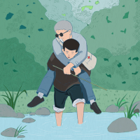 有一次他在河边放牛时,有一位盲人要过河,他便将那盲人背了过去。盲人问了他的姓名,将他编进小曲儿,四乡传唱。