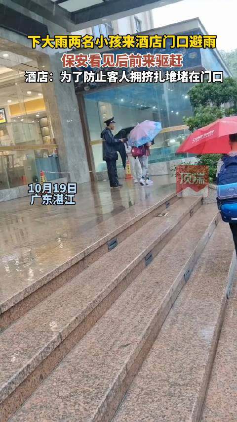 据顶端新闻报道,10月19日,广东湛江一酒店门口,两个背着书包的小学生正在避雨,却被酒店保安驱赶,无奈离去,引发网友不满。酒店工作人员对此回应称,保安这么做也是为大家着想,是为了防止客人拥挤扎堆堵在门口,不过这件事,到时候会跟公司反映一下。
