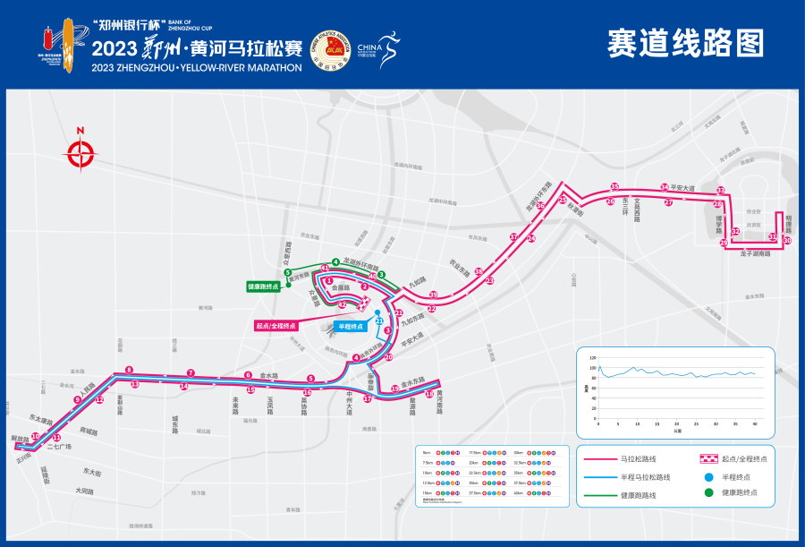 在20日举行的赛事发布会上,郑马的赛道线路图正式官宣。马拉松、半程马拉松、健康跑和家庭跑项目在城区的主赛道进行,起点位于郑东新区CBD会展路。42.195公里的马拉松线路沿途串联起“大玉米”、会展中心、商城遗址、二七塔等城市地标,让选手们在挥洒汗水、全力奔跑的同时,可以一路感受郑州底蕴深厚、源远流长的人文历史、飞速发展的城市建设成就;半程马拉松项目,终点位于商务内环路与九如东路交叉口,约5公里的健康跑和家庭跑项目,终点位于众意西路。主赛道的比赛将于10月29日7:30在郑州国际会展中心鸣枪起跑。