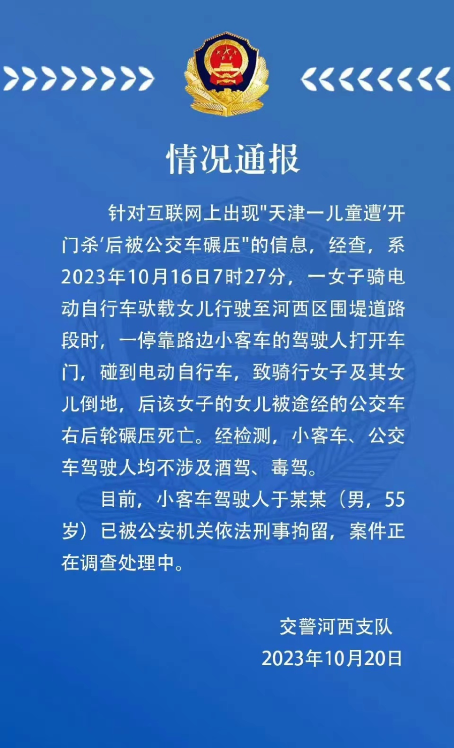 据@天津河西交警 通报,针对互联网上出现“天津一儿童遭开门杀后被公交车碾压”的信息,经查,系2023年10月16日7时27分,一女子骑电动自行车驮载女儿行驶至河西区围堤道路段时,一停靠路边小客车的驾驶人打开车门,碰到电动自行车,致骑行女子及其女儿倒地,后该女子的女儿被途经的公交车右后轮碾压死亡。经检测,小客车、公交车驾驶人均不涉及酒驾、毒驾。目前,小客车驾驶人于某某(男,55岁) 已被公安机关依法刑事拘留,案件正在调查处理中。