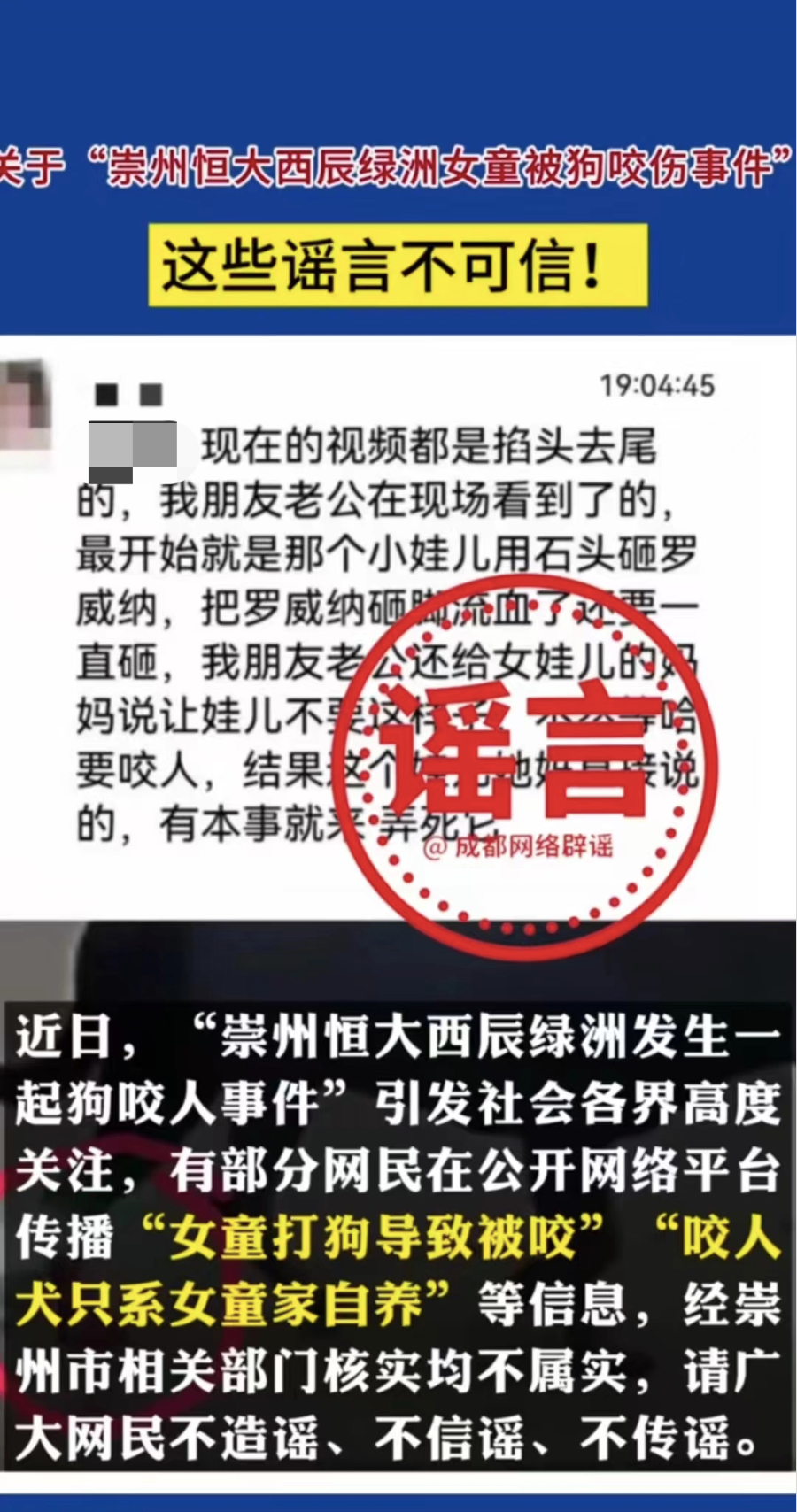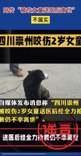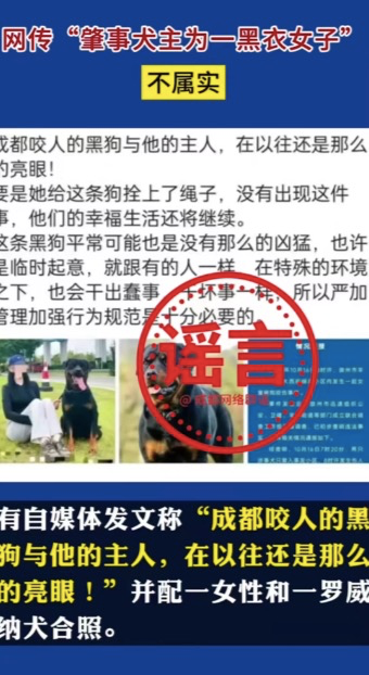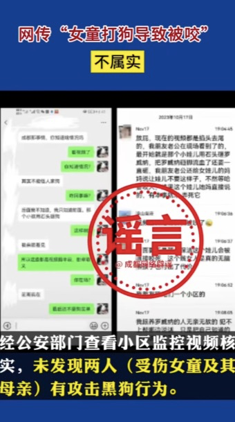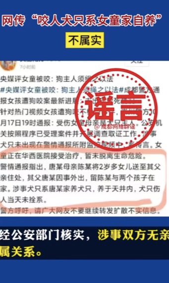 10月19日,成都市互联网信息办公室官方账号@成都网络辟谣 发布消息称,有部分网友在公开网络平台传播“女童打狗导致被咬”“肇事犬主为一黑衣女子”“咬人犬只系女童家自养”“被咬女童送医后离世”等信息,经崇州市相关部门核实均不属实。经核实,未发现受伤女童及其母亲有攻击黑狗行为;目前受伤女童仍在华西医院接受治疗,生命体征平稳;网上流传图片中的黑衣女子并非黑狗主人;涉事双方无亲属关系。