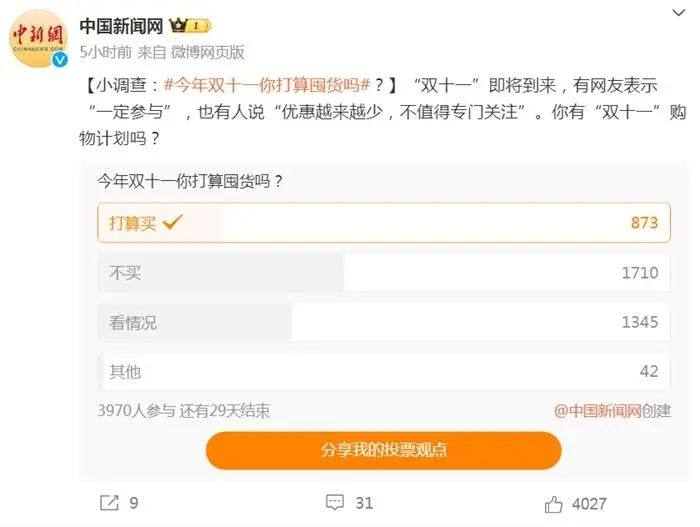 京东零售CEO辛利军近日表示,从趋势看,消费者更加理性,可以买贵的,但不能买贵了,低价是京东刻在骨子里的基因,京东会在供应链里“挤水分”,让利给用户和合作伙伴。记者注意到,今年“双11”电商平台家纷纷上线“买贵就赔”的服务。京东称,“双11”期间,8亿商品全程价保;淘宝则表示,平台上所有百亿补贴商品承诺“买贵必赔”,如果买贵了,平台将补偿差价等额红包。另外,今年“双11”各大电商平台还在物流上面下功夫。例如,京东近日推出即时零售的“三公里模式”,实现3-5公里内“消费者下单、门店发货、商品小时内送达”的闭环。菜鸟则表示,“双11”继续提供半日达、送货上门服务,电器家装保证“一次上门,免费送装”,通过预售极速达模式,部分预售订单甚至要快于日常。中国新闻网微博20日针对“今年‘双11’你打算囤货吗”发起调查。结果显示,选择“不买”和“看情况”的网友最多。但从往年看,网友向来是“嘴硬身体诚实”,最终或还是忍不住下单。