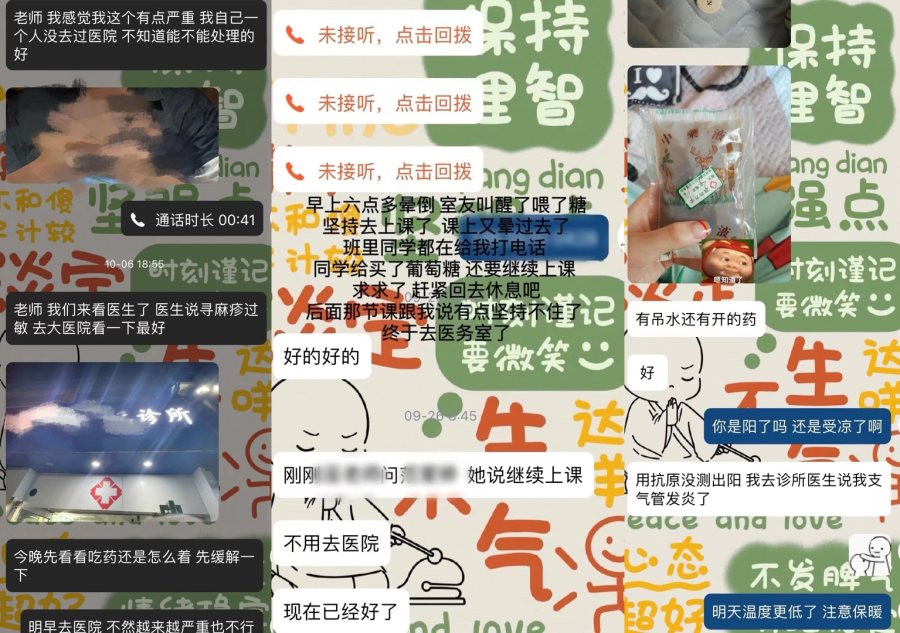“因为我带的学生基数较大,三百多人,每周基本上都会有十几个因生病请假的学生。” 阿宛向中新网介绍,生病的学生中,最常见的是感冒发烧、胃疼等情况,也有一些突发状况,比如“着急下楼收衣服结果被垃圾车刮到,半夜呕吐到进医院,低血糖在课上晕倒”等。