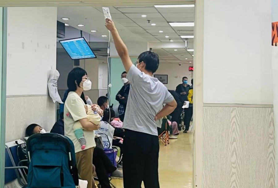 每年8~12月,是北京肺炎支原体感染的高发期,一般在每年11月左右达到高峰。记者在现场观察到,在北京儿童医院支原体患病大都是年纪偏小孩子,往往需要两位以上的家属陪护,在医院走廊中,记者看到一位患儿父亲高举输液瓶,母亲站立抱着孩子,孩子则在妈妈的怀抱中熟睡着,外界嘈杂的声音也未将其吵醒。