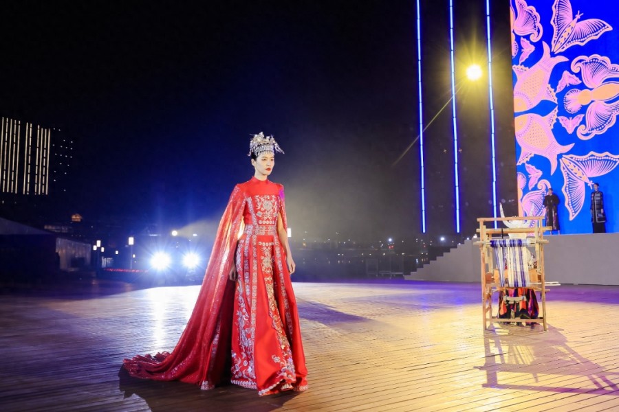高定华服正是融合了苗绣、锡锈、钉珠绣等传统手工艺,将沉淀千年的民族美学与现代时尚品格碰撞融合,折射出多彩的国潮文化与民族艺术,蕴藏在绣品上璀璨的历史文明拥有了最鲜活的表达和最生动的注脚。