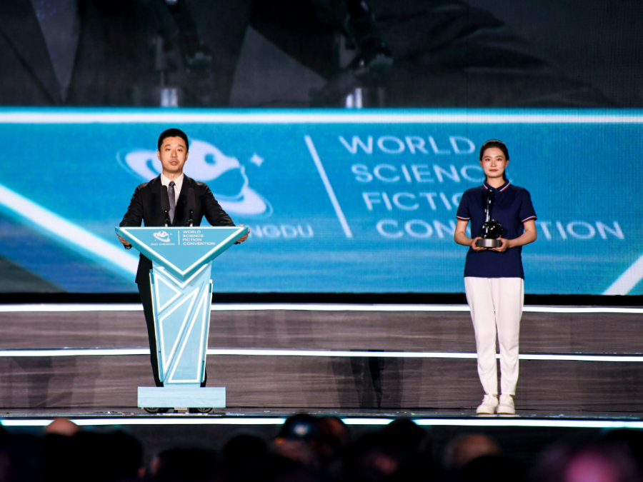 “在得知作品入围时,我就一直在畅想着获奖这一刻,没想到梦想成真了,很激动,也非常荣幸!”当晚,2015雨果奖获得者刘慈欣公布获奖名单并为海漄颁奖,这位“90后”科幻作家在致辞时难掩心中的激动。