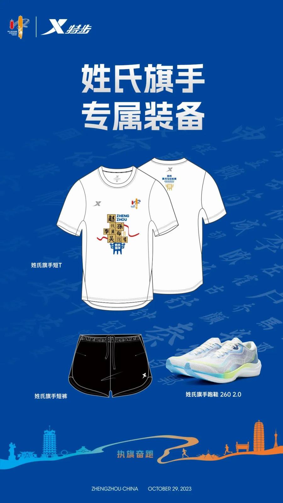 在此,我们恭喜每一位入选“姓氏旗手”的跑友。请在领物现场领取好个人参赛物资后,前往旗手物资发放处领取由特步提供的专属全套运动装备及姓氏战旗。