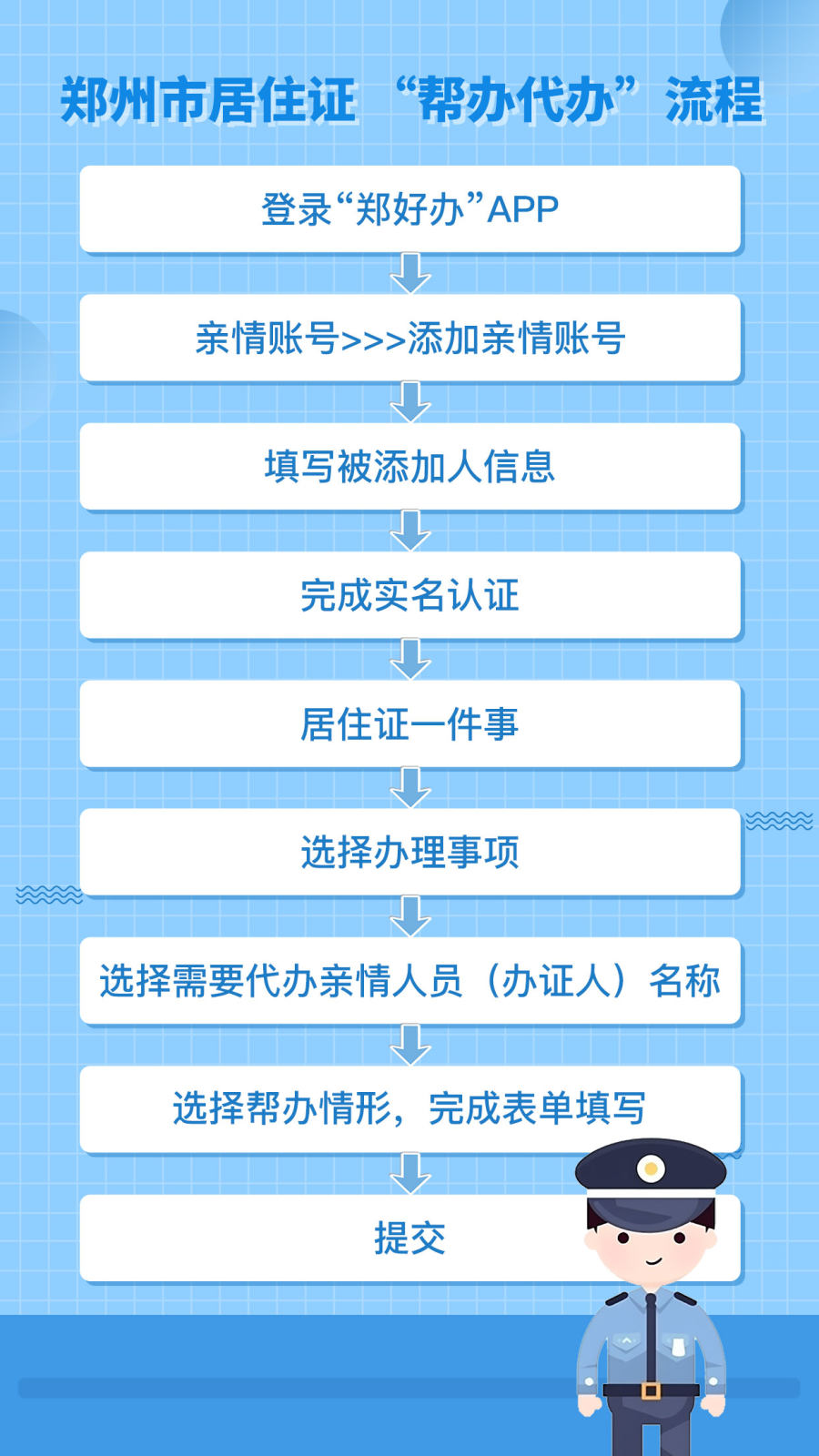 由符合条件的老年人及未成年人在郑居住的直系亲属通过“郑好办”APP为其代办申报暂住登记、申领居住证、网上快速核发居住证以及居住证签注。
