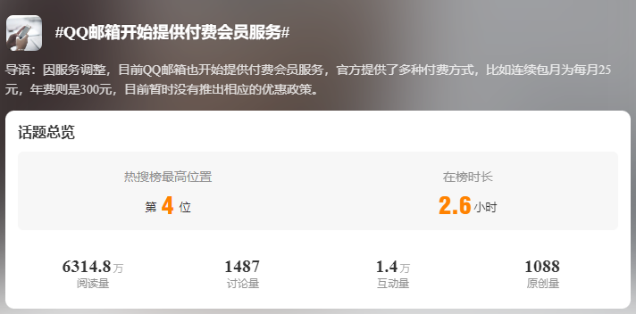 今天,#QQ邮箱开始提供付费会员服务#话题突然冲上热搜,引发网友们的关注。
