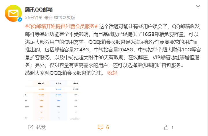 @腾讯QQ邮箱 10月23日发文称,QQ邮箱开始提供付费会员服务这个话题可能让有些用户误会了,QQ邮箱收发邮件等基础功能完全不受影响,而且基础版已经提供了16GB邮箱免费容量,可以满足大部分用户的使用需求。
