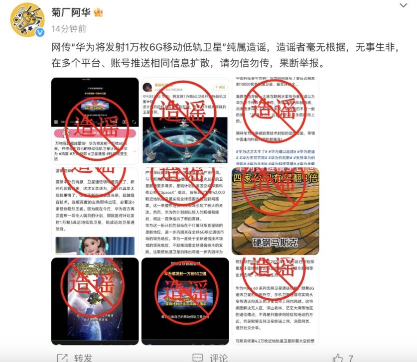 辟谣声明称,“网传‘华为将发射1万枚6G移动低轨卫星’纯属造谣,造谣者毫无根据,无事生非,在多个平台、账号推送相同信息扩散,请勿信勿传,果断举报。”