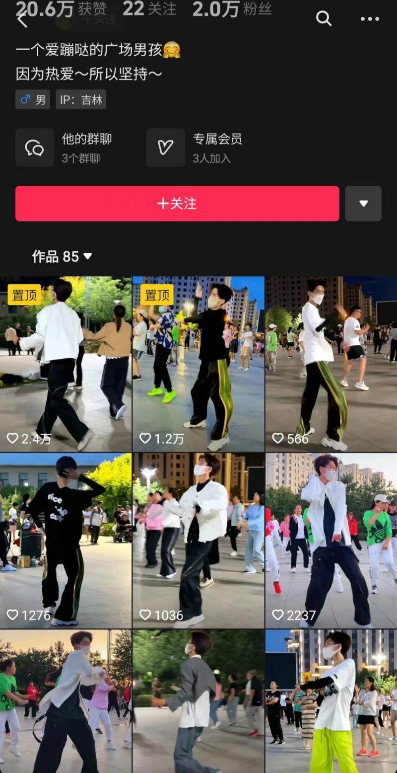 伴随着激昂的旋律和洪亮、欢快的女声,广场上,一个打扮时尚的男生随着舞曲的标志性韵律,前后迈步、伸展手臂、扩胸、摆臀,一套动作下来行云流水,轻盈而有力。就在一个鼓点的间隙,他将遮挡住视线的一缕头发潇洒地甩向一侧。