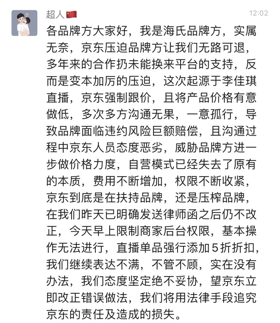 面对质疑,10月24日上午,京东采销工作人员发布朋友圈,称此次改价“完全是京东自掏腰包”,并直接喊话李佳琦。该工作人员表示,京东收到了品牌商海氏的律师函,被品牌投诉由于某款海氏烤箱的京东价格低于李佳琦直播售价,违反了他们与李佳琦签署的“底价协议”,并要求赔偿巨额违约金。