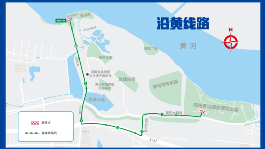 郑州黄河国家湿地公园→黄河大坝路→黄河观光路→黄河旅游公路→天河路→天河北路→南裹头广场