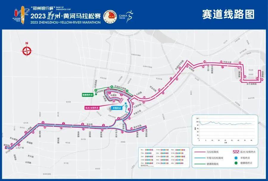 (一)全程马拉松赛道。起点设在会展路——众意路——黄河东路——九如路——商务外环路——金水路辅路——金水路——紫荆山立交桥二层——人民路——二七广场——解放路与民主路交叉口东侧(折返)——二七广场——人民路——紫荆山立交桥二层——金水路——金水东路——金水东路与黄河南路交叉口(折返)——金水东路——通泰路——商务外环路——九如路——龙湖外环东路——秋澄街——平安大道——博学路——龙子湖南路——明理路——明理路与修业街交叉口(折返)——明理路——龙子湖南路——博学路——平安大道——秋澄街——龙湖外环东路——九如路——黄河东路——众意路——会展路——至比赛终点(全程42.195公里)。