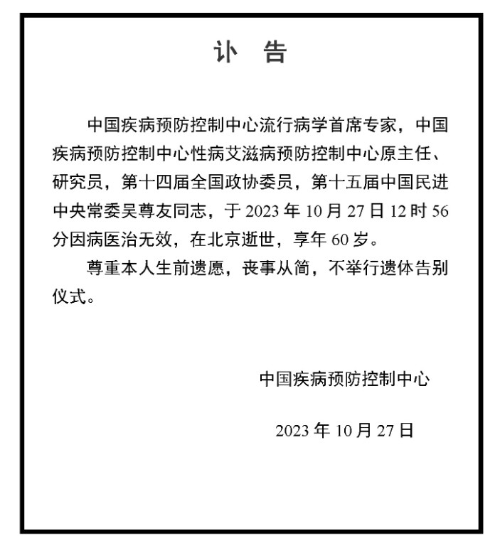 中国疾病预防控制中心官网发布讣告,中国疾病预防控制中心流行病学首席专家,中国疾病预防控制中心性病艾滋病预防控制中心原主任、研究员,第十四届全国政协委员,第十五届中国民进中央常委吴尊友同志,于2023年10月27日12时56分因病医治无效,在北京逝世,享年60岁。