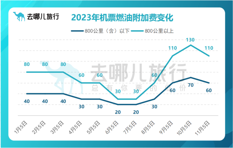 10月27日,记者获悉,在线旅游平台“去哪儿”接到航空公司消息,自2023年11月5日(出票日期)起,成人旅客:800公里(含)以下航线每位旅客收取60元燃油附加费,800公里以上航线每位旅客收取110元燃油附加费。机票燃油附加费相较于调整前分别降低了10元和20元。