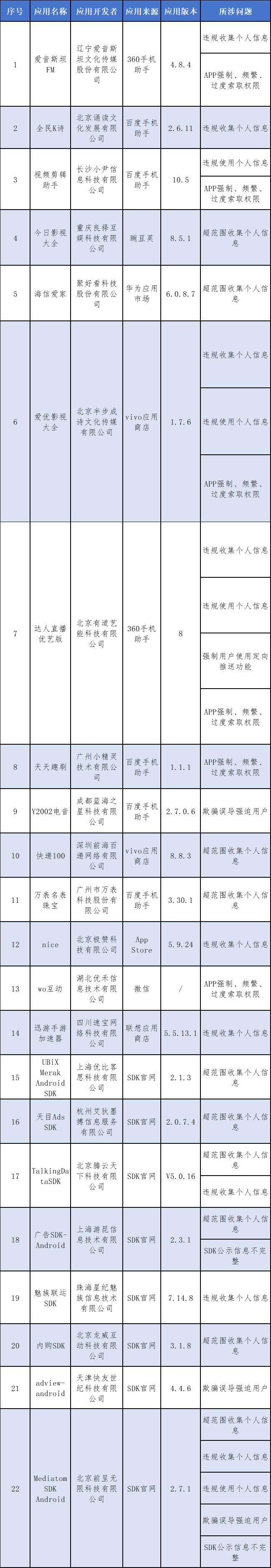 关于侵害用户权益行为的APP(SDK)通报