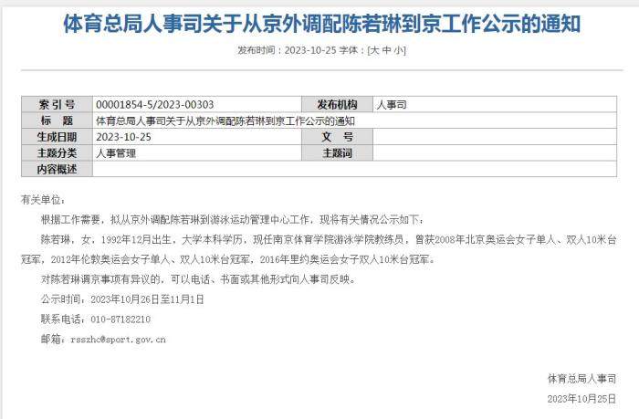 日前,国家体育总局人事司发布“体育总局人事司关于从京外调配陈若琳到京工作公示的通知”(以下简称《通知》)。