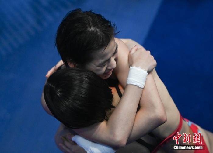 资料图:10月3日,杭州第19届亚运会跳水项目女子10米跳台决赛。中国选手全红婵夺冠。图为全红婵(上)和陈芋汐赛后拥抱。中新社记者 王刚 摄