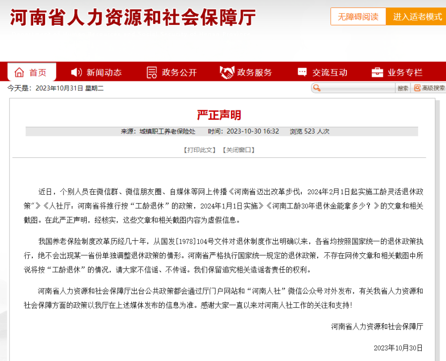 10月30日,河南省人力资源和社会保障厅网站就近期网上传播的有关“工龄退休”的文章和相关截图发布严正声明。