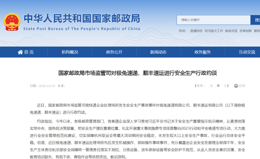 国家邮政局市场监管司对极兔速递、顺丰速运进行安全生产行政约谈