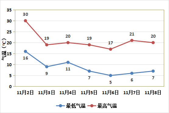 图1 2023年11月2日08时至9日08时郑州市气温趋势图(单位:℃)