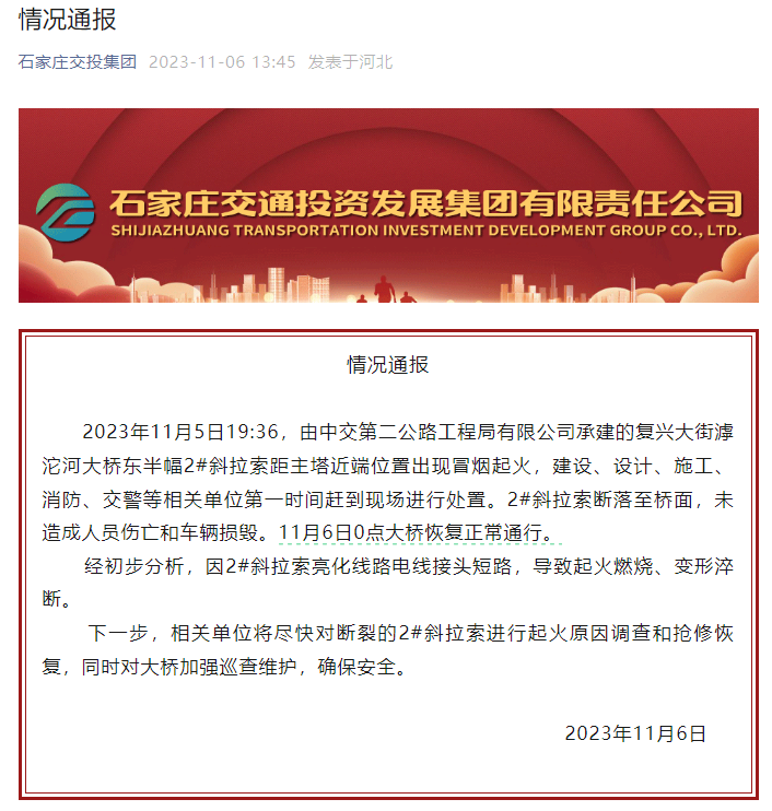 石家庄“网红大桥”悬索断裂起火?建设单位通报