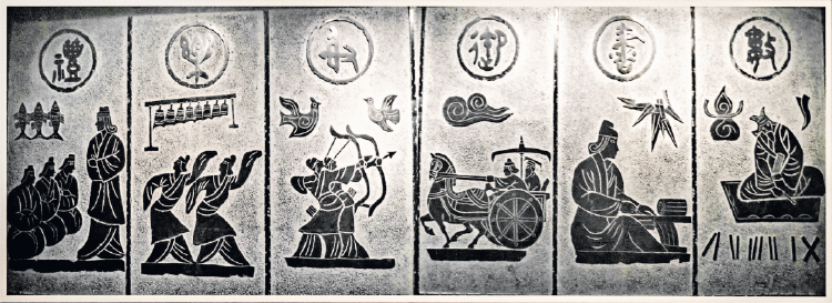 表现西周“六艺”的现代石刻,左起依次为 礼、乐、射、御、书、数。北京考古遗址博物馆