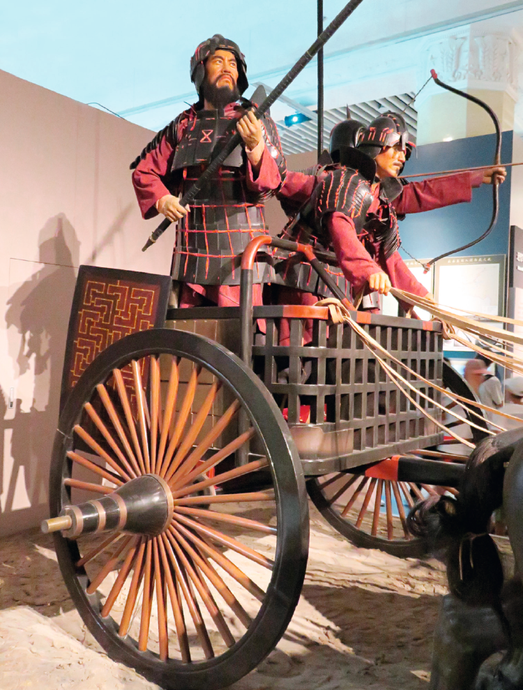 古代战车作战场景复原。随着步卒结阵而战的形式淘汰了效率低下的车战,射、御这些技能更不再是贵族们独享。基于这种现实,孔子和儒家谋求转变,开发出全新的教学内容