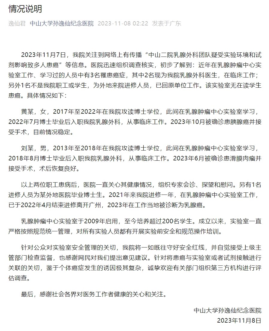 11月8日凌晨,中山大学孙逸仙纪念医院(中山大学附属第二医院,简称“中山二院”)发布情况说明称,11月7日,该院关注到网络上有传播“中山二院乳腺外科团队疑受实验环境和试剂影响致多人患癌”等信息。医院迅速组织调查核实,初步了解到:近年在乳腺肿瘤中心实验室工作、学习过的人员中有3名罹患癌症,其中2名现为该院乳腺外科医生,在临床工作;另外1名不是该院职工或学生,为外地来院进修人员,已回原单位工作。该实验室无在读学生患癌。具体情况如下: