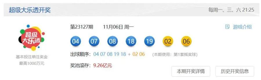 奖池方面,当期开奖结束后,9.26亿元滚存至11月8日(周三)开奖的第23128期。