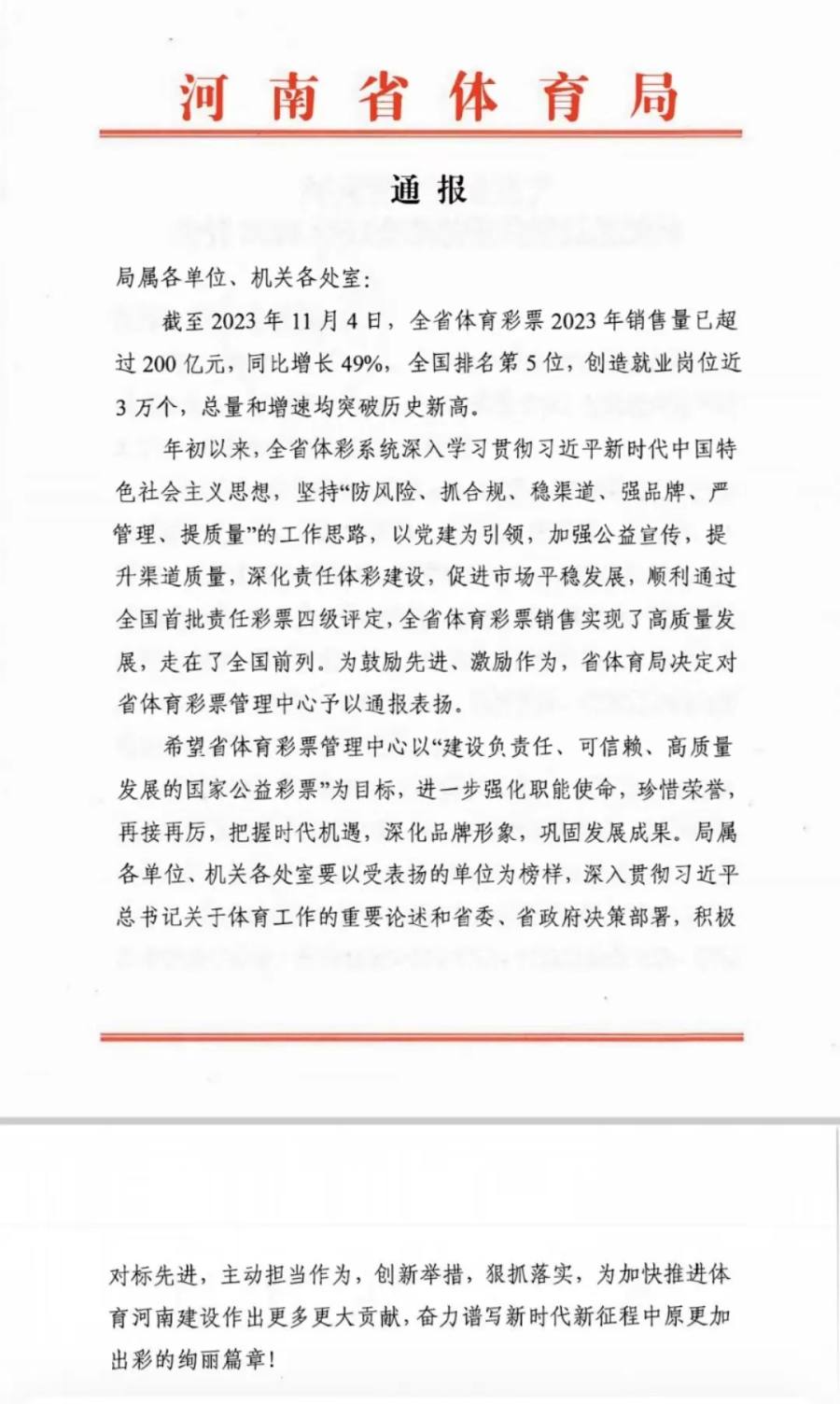 近日,记者从河南省体彩中心获悉,在河南体彩年销量突破200亿元大关、年销量和公益金筹集量创新高之际,河南省体育局对河南省体彩中心进行了通报表扬。