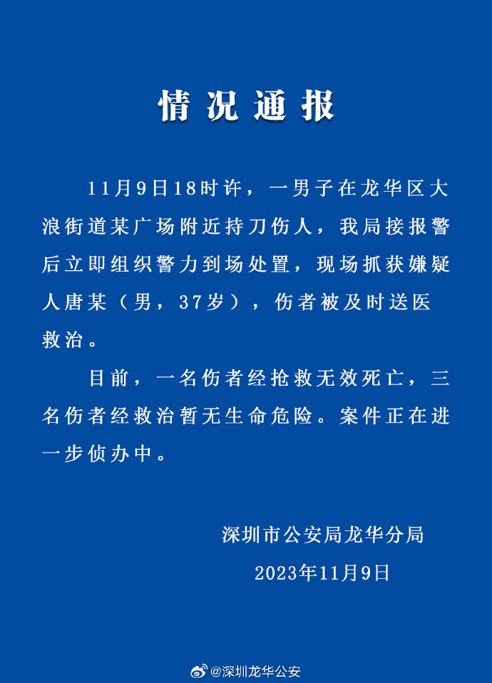 一男子在广场持刀伤人致1死3伤,深圳警方通报