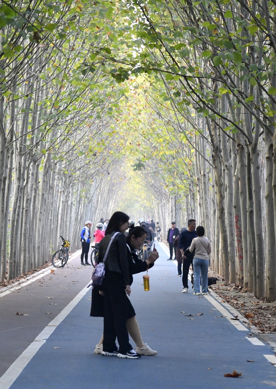 时值初冬,记者来到了郑州市惠济区的黄河滩地公园疏影路,如丝线般细密的夕阳穿过一侧整齐紧致的法桐林,在疏影路上留下一道道充满节奏的明暗光影。道路两侧的树林里,成群的孩童们寻找枯枝搭建小帐篷的骨架,小脚踩在满地枯黄的枫叶上,发出嘎吱嘎吱的声音。这里俨然成了市民的网红打卡胜地。
