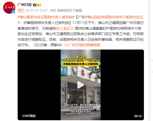 广东佛山回应有医院勾结中介贩卖出生证:相关负责人被刑拘