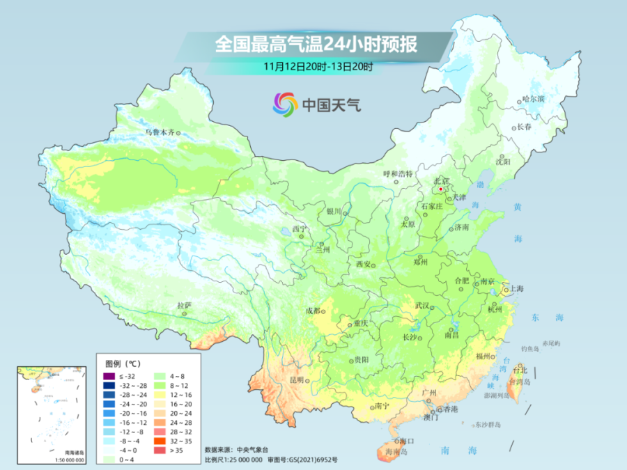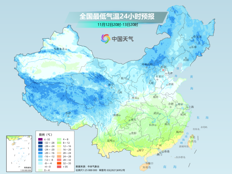 这两天北方气温基本到谷底了,11月12日早上最低气温0℃线位于河南南部、山东南部、陕西南部、甘肃南部、四川西部、西藏南部一带。